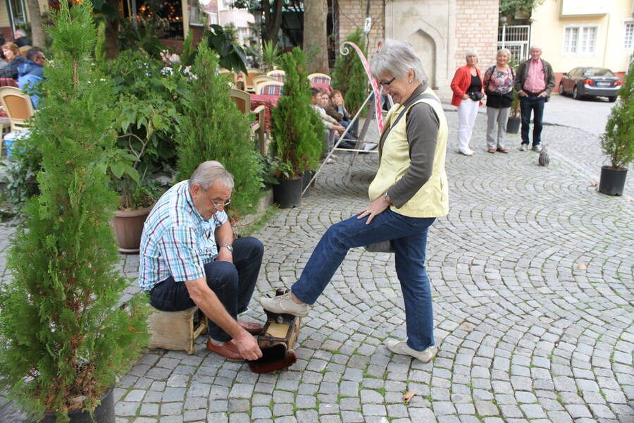 Nach der üblichen Morgenandacht und unserem Gesang, in Begleitung unserer „Organisten“ Christa (Flöte) und Hartmut (Schlauchtrompete), erzählt uns Zafer über das Arbeiten und Leben in Istanbul. Über das 8-spurige „Nadelöhr“, die Galatabrücke überqueren wir das Goldene Horn, eine schmale Bucht an dessen westlichem Ufer wir die ehemaligen griechischen und jüdischen Viertel sehen. Wir überqueren die Bosporusbrücke und sind jetzt auf dem asiatischen Teil Istanbuls. Die Überfahrt über das Marmarameer dauert 40 min. Das erste Tagesziel ist Iznik, das alte Nizäa. Vorbei an unzähligen Olivenhainen, mit einem Vortrag über die wichtigsten Ereignisse aus der Geschichte der Türkei erreichen wir gegen Mittag unser Ziel. Wir besuchen die Ruinen des alten römischen Theaters und machen anschließend Mittagsrast in einem Restaurant am Iznik-See. Köstliche Speisen und Getränke werden uns gereicht. Frisch gestärkt fahren wir zur Konzilskirche Hagia Sophia, danach weiter ins ca. 80 km entfernte Bursa, der ersten Hauptstadt des Osmanenreichs. Hier besuchen wir die Große Moschee mit 20 Kuppeln (Schuhe aus! Damen das Haar bedecken!) und bummeln anschließend über den Seidenbasar. Wir beziehen unser sehr schönes Hotel für 1 Nacht. Im Speisesaal im 12. Stockwerk erwartet uns ein reich gedecktes Abendbuffet.